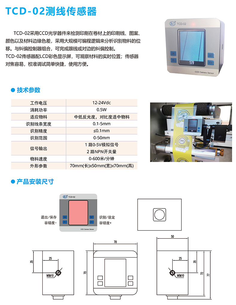 TCD-02采用CCD光学器件来检测印刷在卷材上的印刷线、图案、颜色以及材料边缘色差,采用大规模可编程逻辑来分析识别物料的位移。与纠偏控制器组合可完成跟线或对边的纠偏控制。TCD-02传感器配LCD彩色显示屏,可观察材料的实时位置;传感器对焦容易校准调试简单快捷,使用方便。