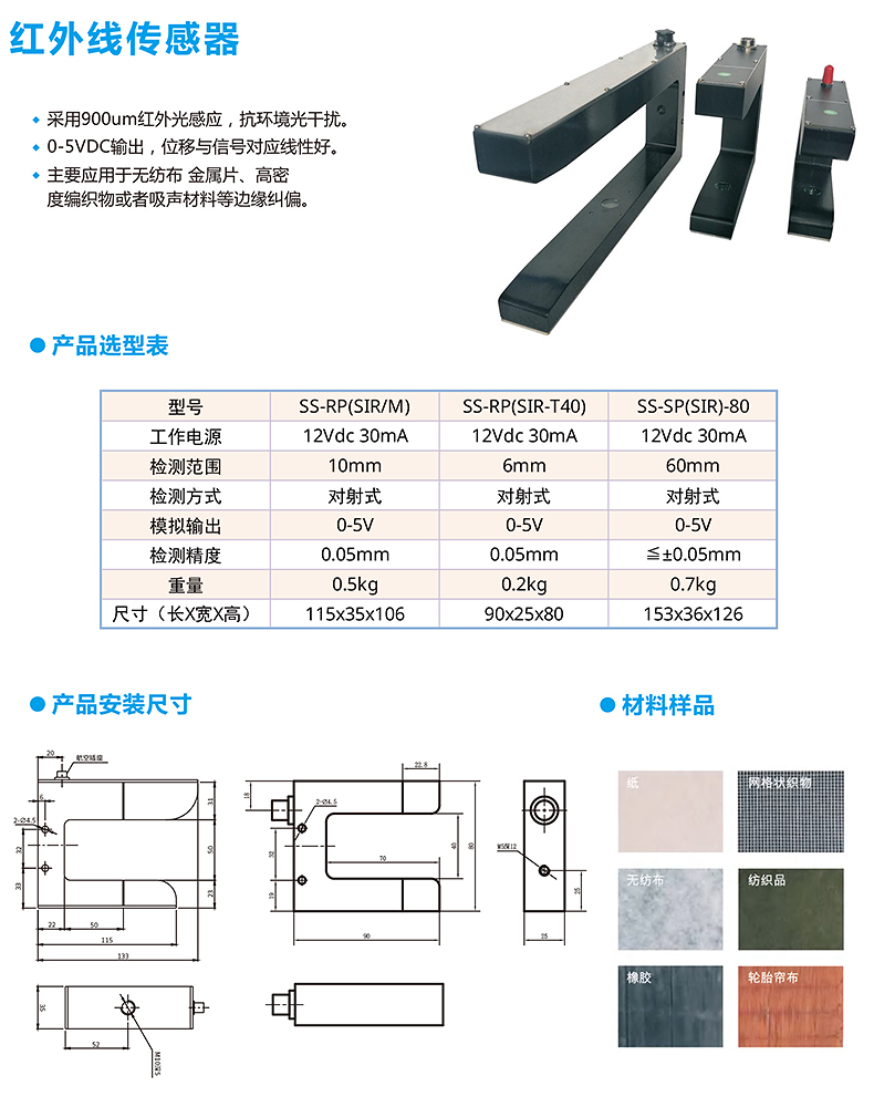 采用90Oum红外光感应,抗环境光干扰。0-5VDC输出,位移与信号对应线性好。主要应用于无纺布、金属片、高密度编织物或者吸声材料等边缘纠偏。