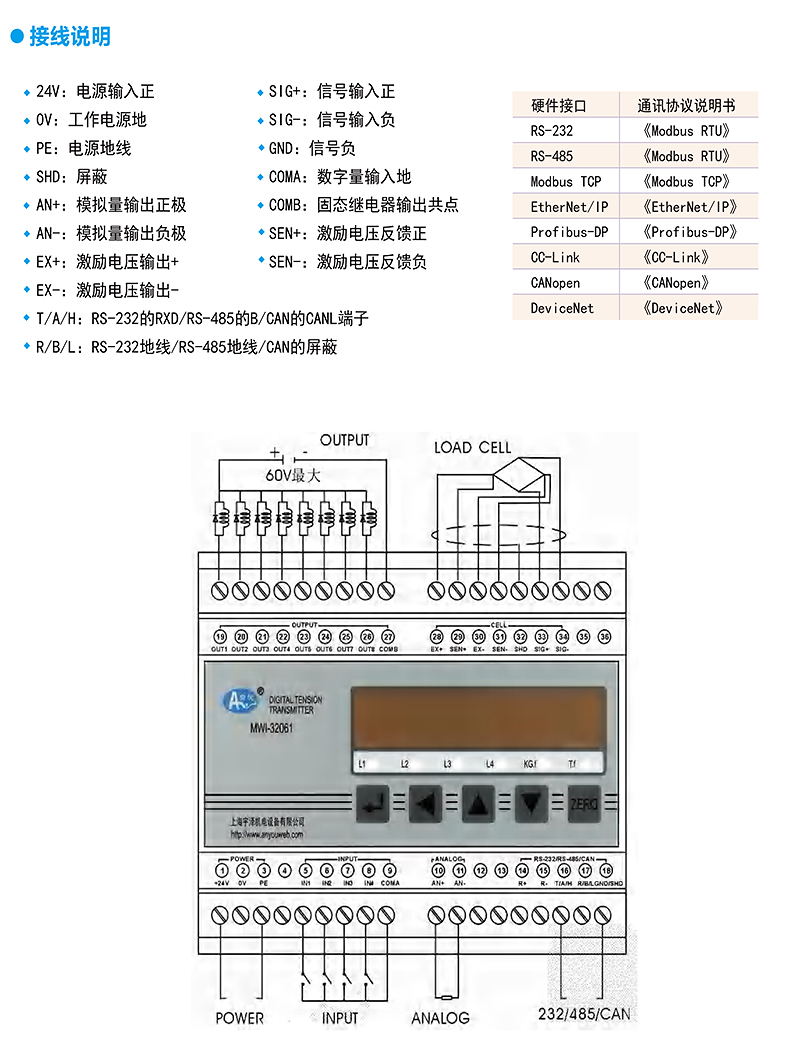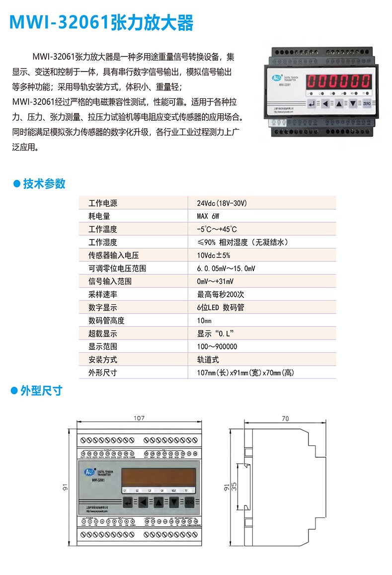 MWI-32061张力放大器是一种多用途重量信号转换设备,集显示、变送和控制于一体,具有串行数字信号输出,模拟信号输出等多种功能;采用导轨安装方式,体积小、重量轻;MWI-32061经过严格的电磁兼容性测试,性能可靠。适用于各种拉力、压力、张力测量、拉压力试验机等电阻应变式传感器的应用场合。同时能满足模拟张力传感器的数字化升级,各行业工业过程测力上广泛应用。