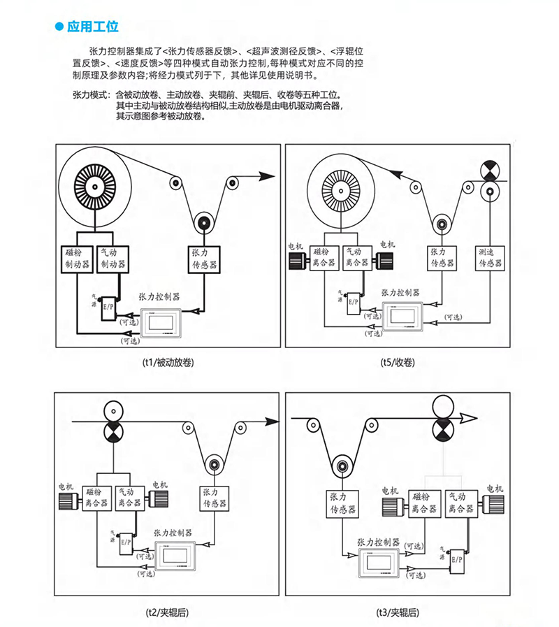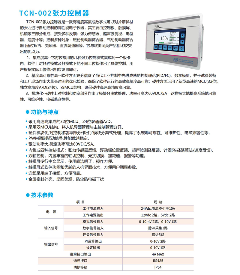 TCN-002张力控制器是一款高精度高集成数字式可以对片带状材的张力进行自动控制的高性能电子仪器,其主要由控制板、触摸屏、机箱等三部分组成。接受多种反馈:张力传感器、超声波测径、电位器、速度计等;控制多种对象:磁粉制动器离合器、气动制动器离合器 (通过E/P)、变频器、直流调速器等。